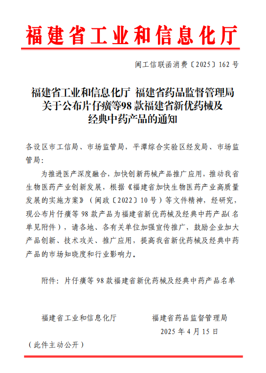 福建省工業和信息化廳福建省藥品監督管理局關于公布片仔癀等98款福建省新優藥械及經典中藥產品的通知